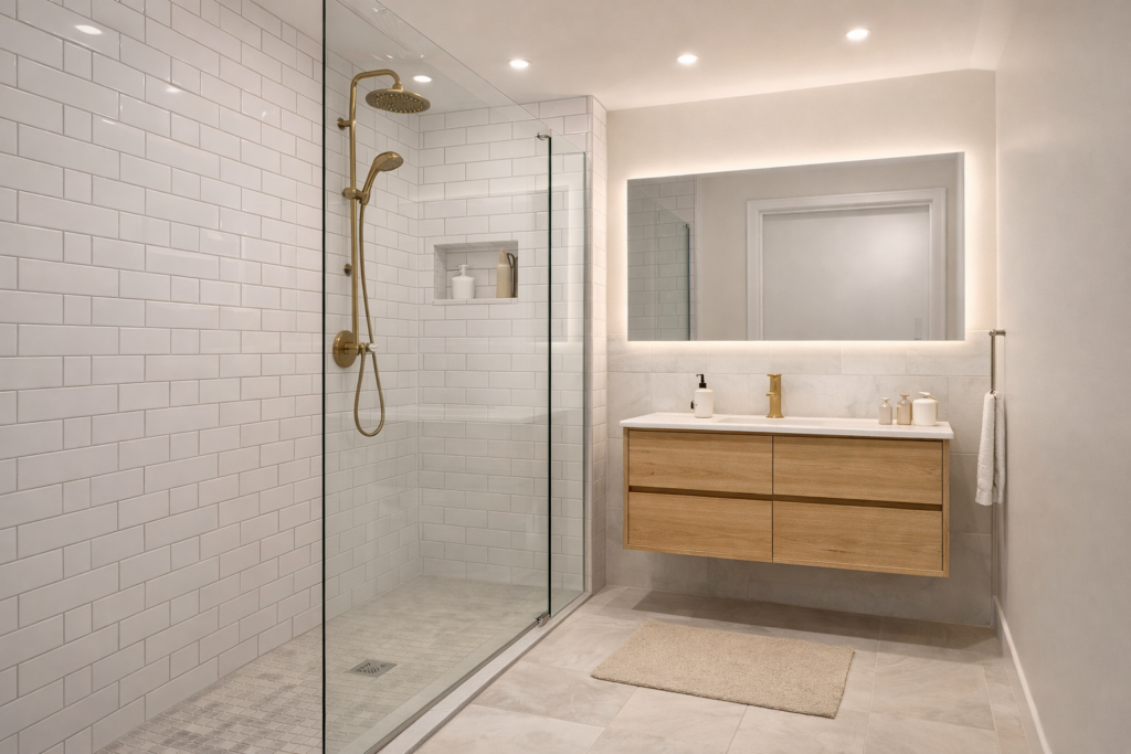 DG Rénov intervient pour la création ou la rénovation de douches, en garantissant une étanchéité adaptée et une mise en œuvre durable.